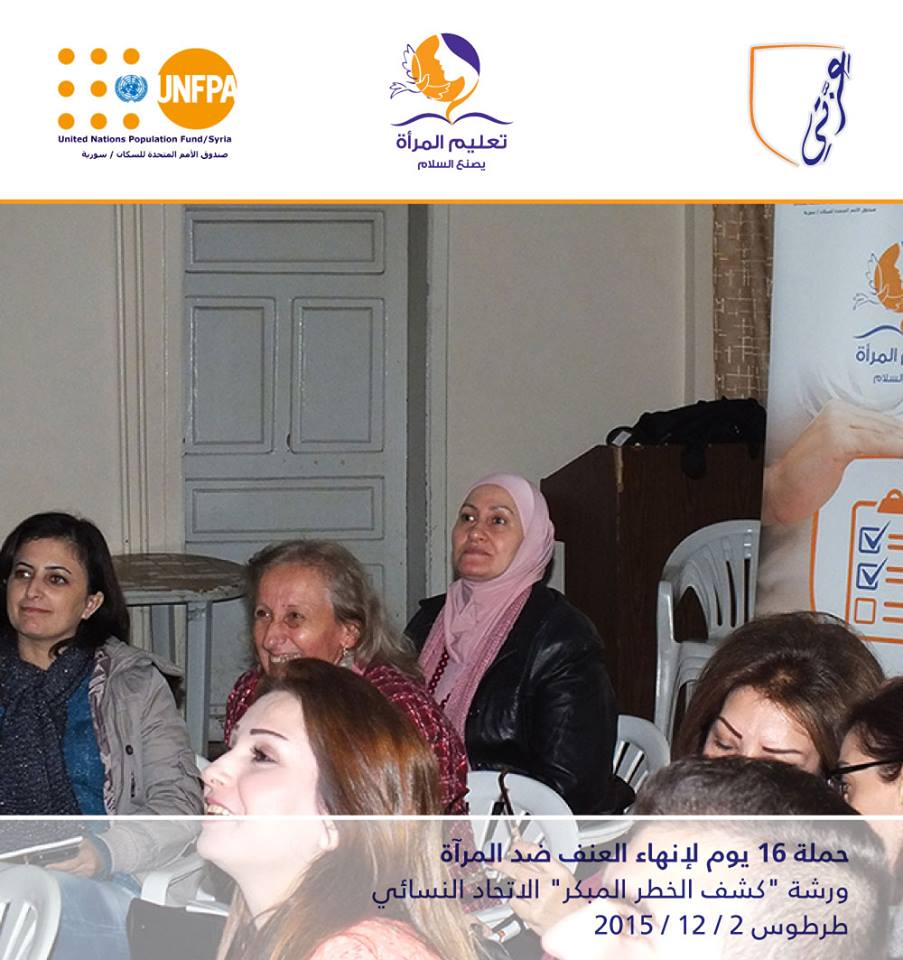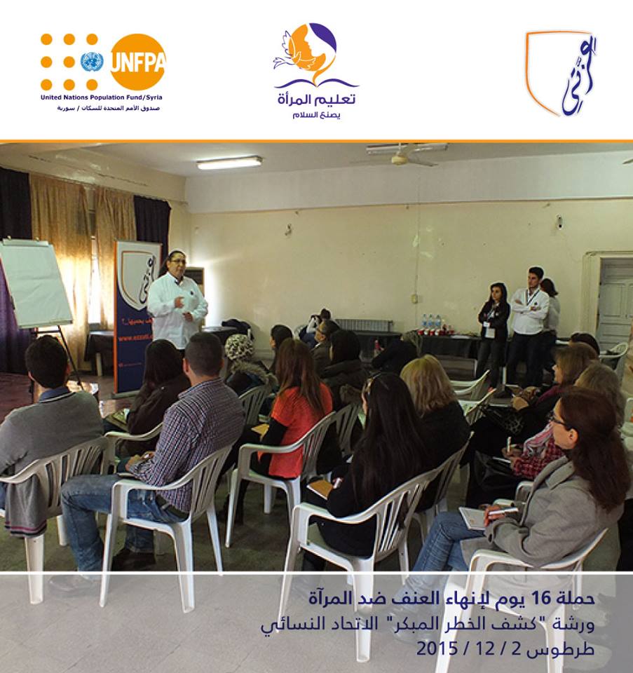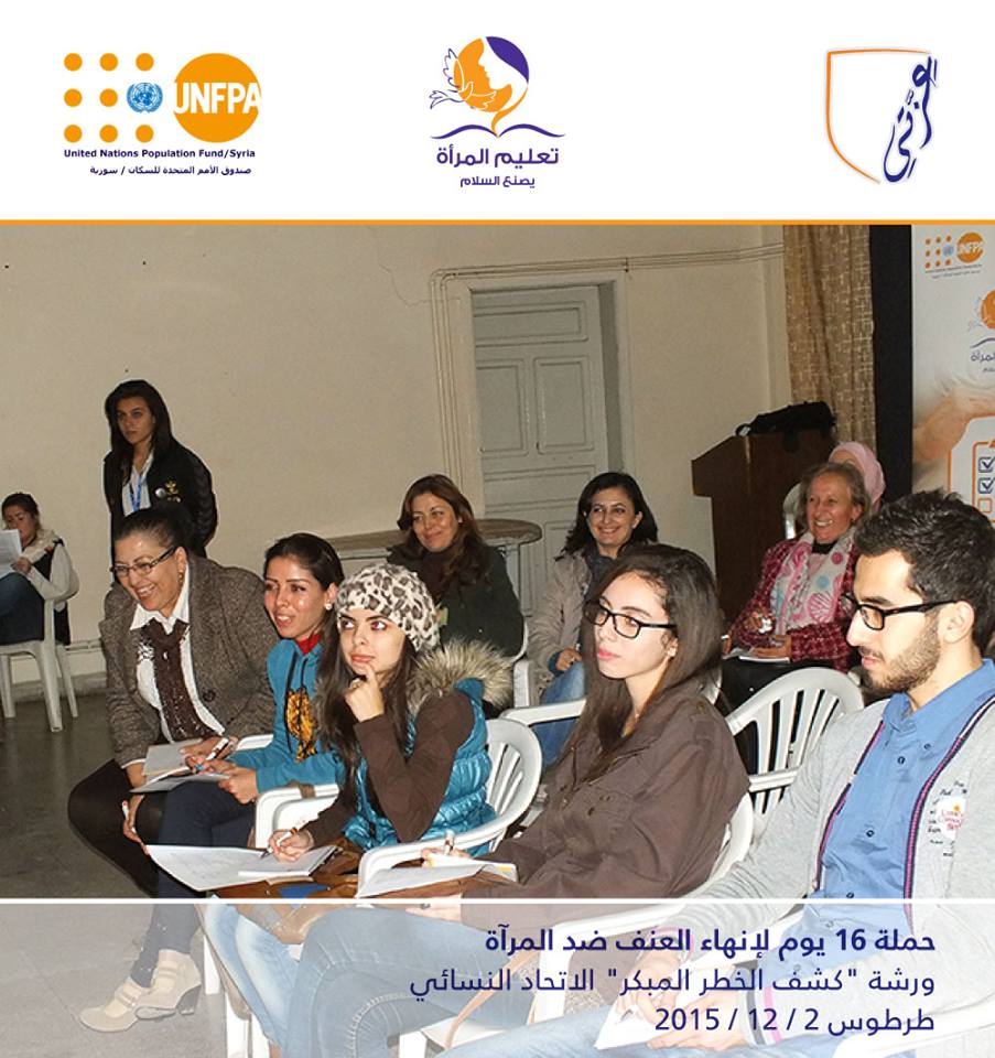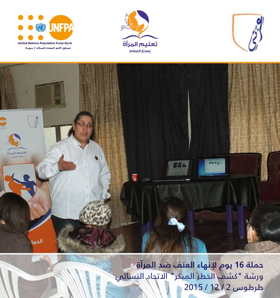 من هنا جاءت فكرة الحفاظ على سلامة الانسان والوقاية من الأشياء لتلافي خطرها على النفس والممتلكات تلك كانت مواضيع الورشة التوعوية "كشف الخطر المبكر" في طرطوس التي قدمتها مؤسسة عزتي ضمن حملة 16 يوما لإنهاء العنف ضد المرأة وتحت شعار تعليم المرأة يصنع السلام تنوع الحضور من مختلف الجهات والخلفيات الثقافية اغنى ورشة العمل بعدة نقاشات فعالة حول كيفية كشف الخطرالمحيط في أماكن العمل او المنزل او حتى في الشارع الحضور من جمعية الاسلامية الجعفرية - الإتحاد النسائي - جمعية تنظيم الأسرة السورية- جمعية المرأة الذكية العدد 23 المحاضرون عزة عطورة