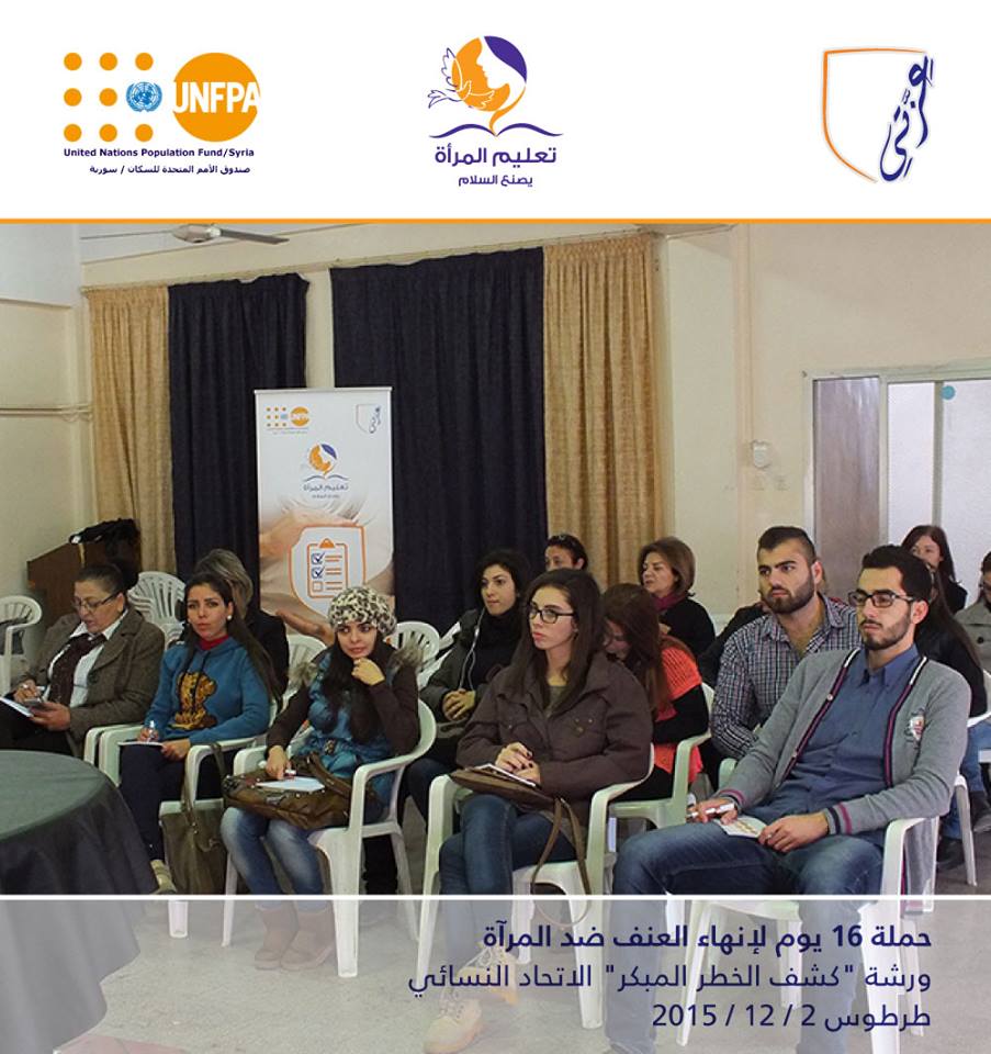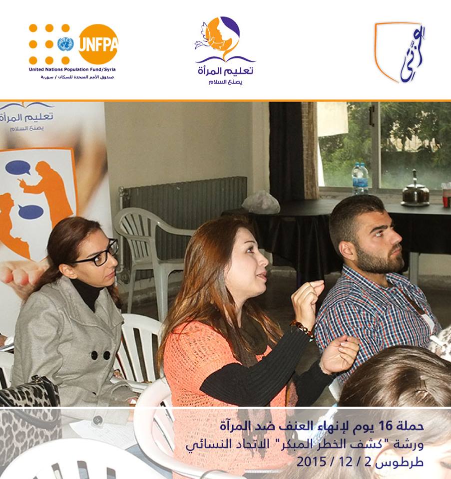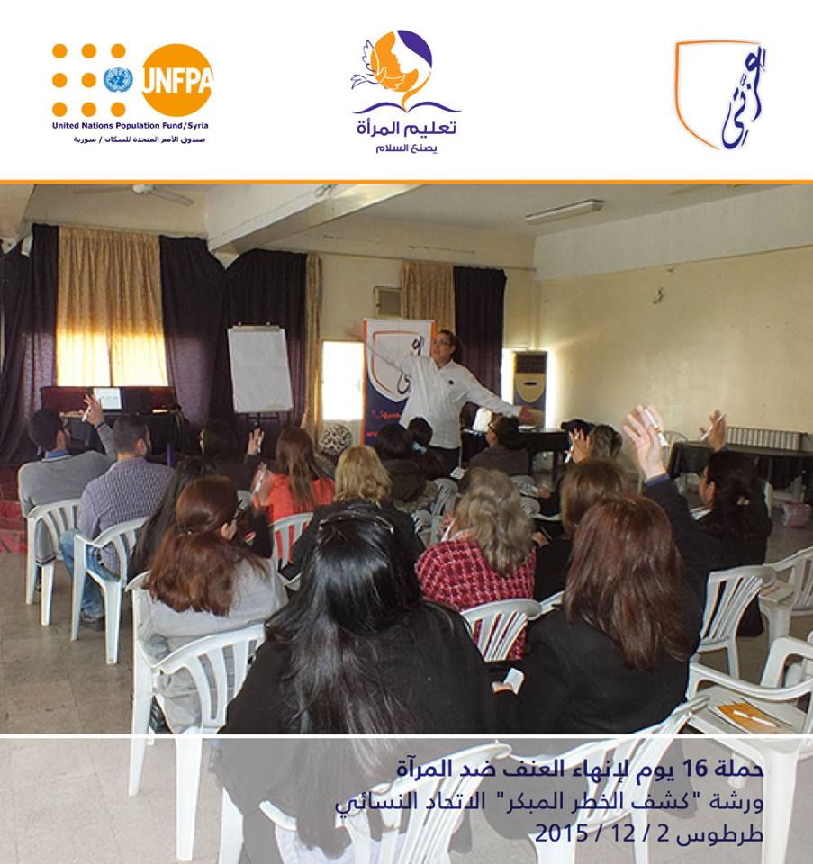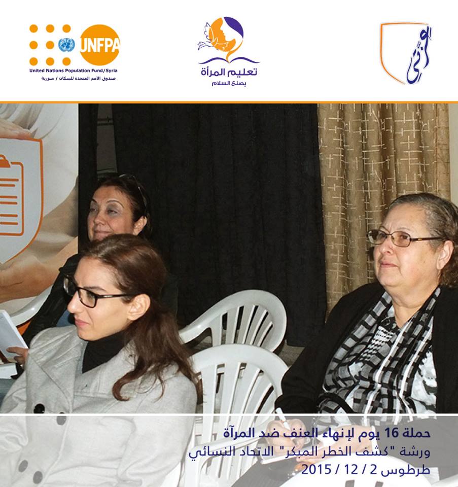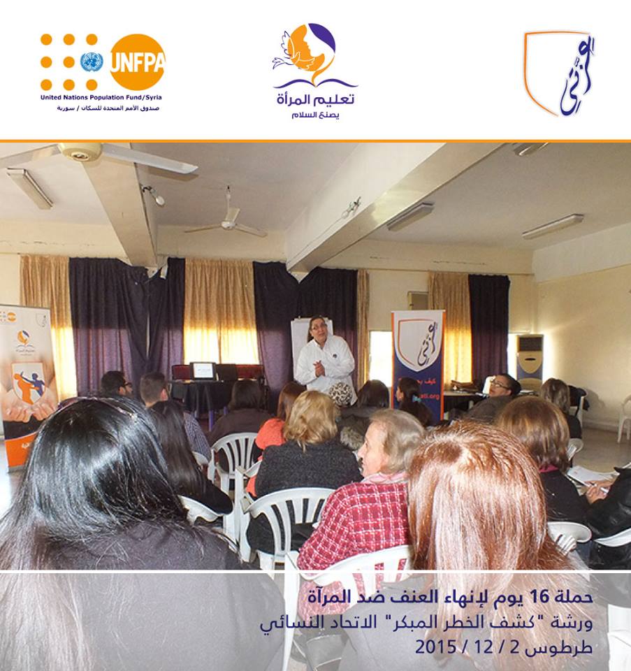 ورشة كشف الخطر المبكر الاتحاد النسائي - فرع طرطوس 2/12/2015 تختلف الأماكن التي يزاول بها الفرد نشاطه اليومي من المنزل لمكان العمل إلى أماكن الترفيه وغيرها... حيث قد يتسبب حادث صغير كوكزه من زاوية طاولة لتمزق جيب المعطف أو قد ينشأ حادث أخطر قد يودي لا قدر الله بحياة الأشخاص وذلك كله بسبب لا مبالاة لأمور قد تبدو ظاهراً بسيطة إلا أن توافق ظروف معينة معها قد يودي لكارثة حقيقية!