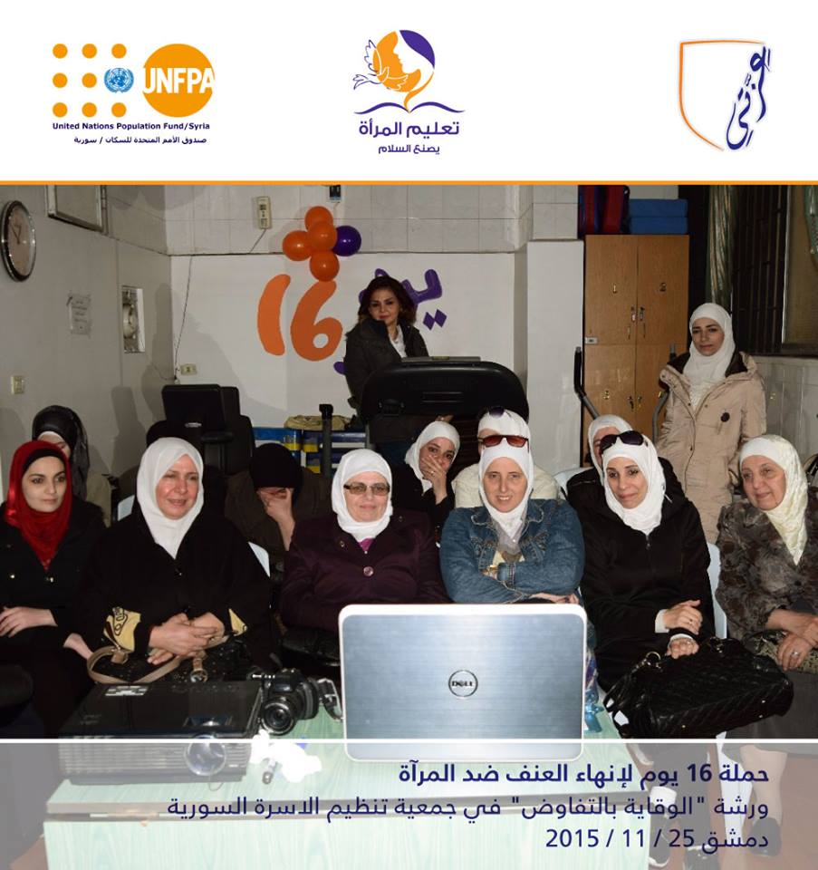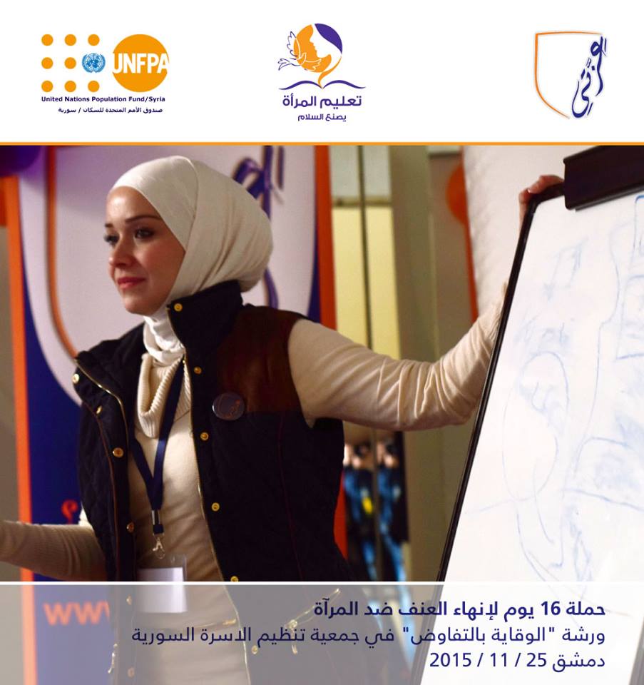 "الوقاية بالتفاوض" عنوان الورشة الأولى التي أقامتها مؤسسة عزتي فبتاريخ 25 /11 /2015 في جمعية تنظيم الأسرة السورية /الحلبوني ضمن حملة 16 يوم لإنهاء العنف ضد المرأة التي أطلقتها منظمة صندوق الأمم المتحدة للسكان UNFPA تحت عنوان "تعليم المرأة يصنع السلام"